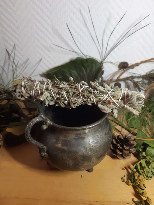 Ce bâton de fumigation rassemble sauge officinale et romarin, cueillis à la main dans des zones préservées puis séchés et assemblés artisanalement.